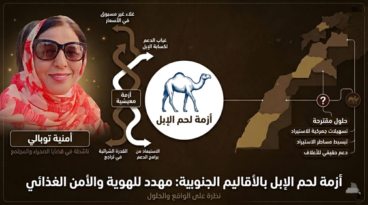 أكدت الأستاذة أمينة التوبالي، الناشطة في قضايا الصحراء والمجتمع، أن الارتفاع المتواصل في أسعار لحم الإبل بالأقاليم الجنوبية لم يعد مجرد تقلب عابر في السوق، بل أصبح مؤشرا مقلقا على أزمة تمس بشكل مباشر الأمن الغذائي والاجتماعي لساكنة الصحراء، في ظل ما وصفته بتراجع القدرة الشرائية وغياب تدخل منصف يعيد التوازن لهذا القطاع الحيوي.